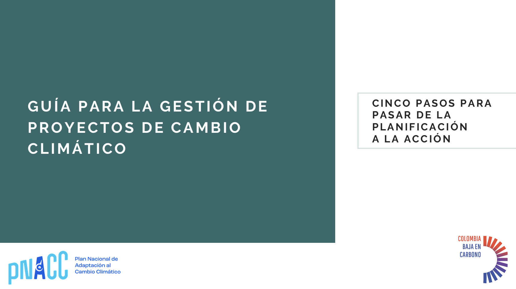 Guía práctica para orientar el desarrollo y gestión de proyectos de cambio climático. A través de este documento conocerá cinco pasos prácticos para pasar de la planificación a la implementación de proyectos de cambio climático: 1) Identifique iniciativas. 2) Conozca la información para la acción. 3) Articule su propuesta con instrumentos de planeación. 4) Evalúe el contexto y los actores claves de su iniciativa. 5) Identifique las fuentes de financiación.